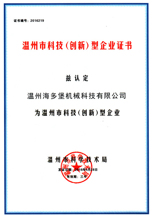 溫州海多堡機(jī)械科技,于2016年被認(rèn)定為溫州市科技(創(chuàng)新)型企業(yè),同時(shí)授予溫州市科技(創(chuàng)新)型企業(yè)證書。